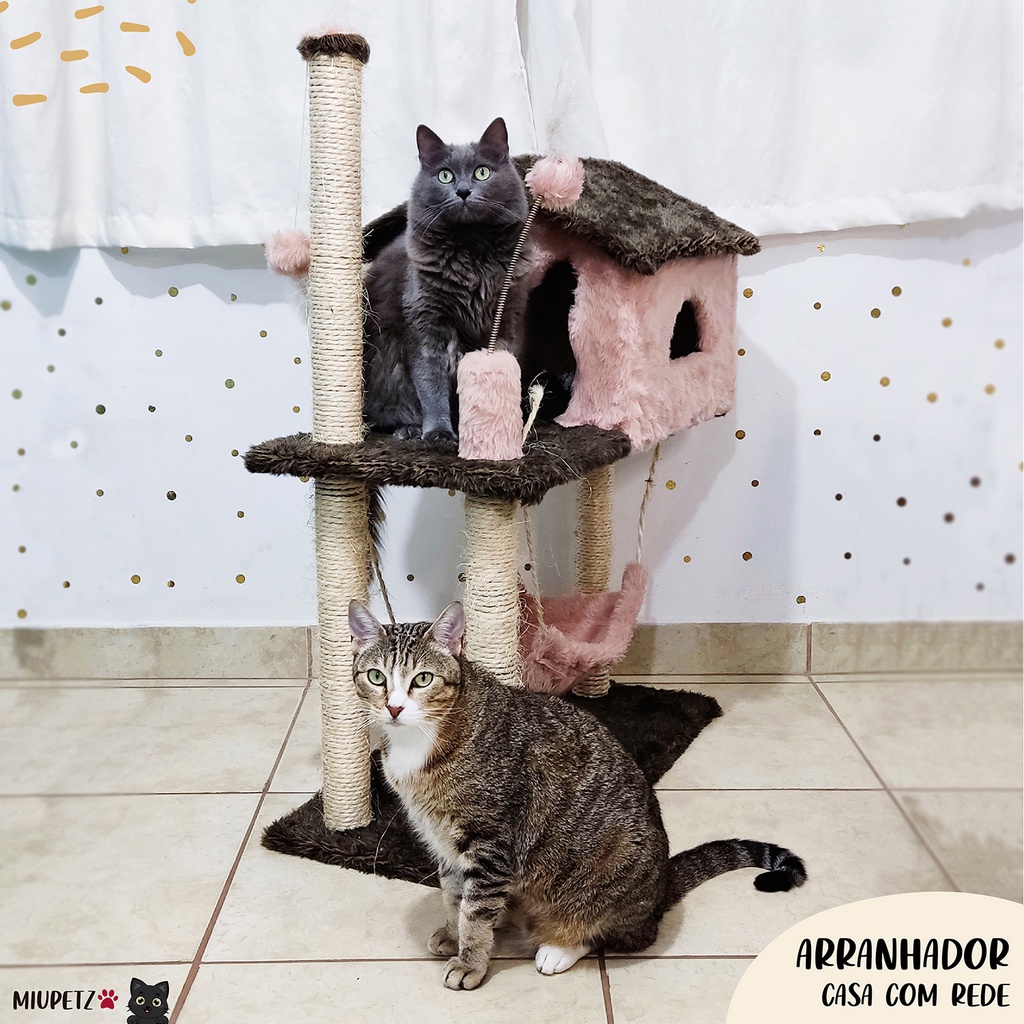 Kit Arranhador Para Gato Casa Com Rede e 2 Brinquedos + Poste com Base - Miupetz Store