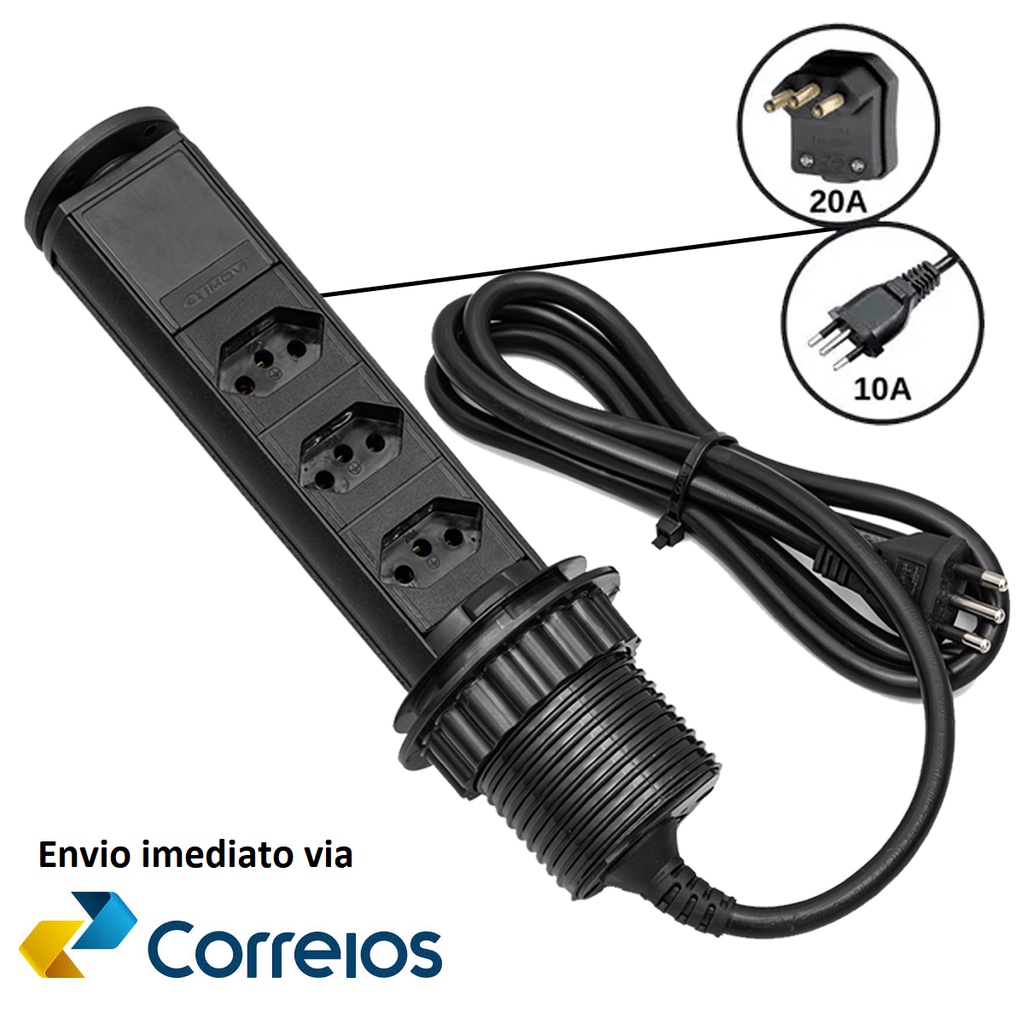 Torre Tomada 3 Elétrica 10A 20A Extensao - Cozinha - Preto Tipo Totem Multiplug Extensão Antichoque Anti-choque Retrátil Embutir Sobrepor em Mesa, Bancada ou Móvel