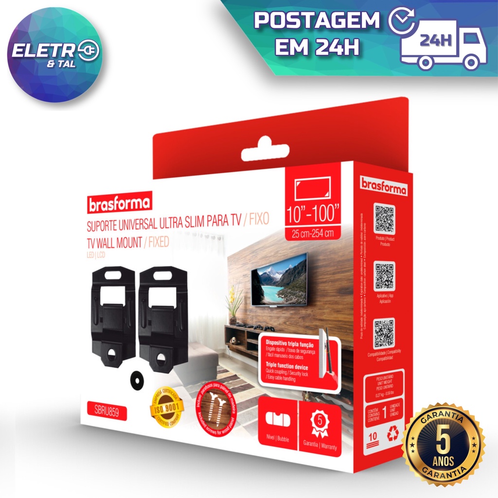 Suporte de Tv Universal Fixo LED LCD Plasma 10 24 32 43 50 55 até 100’’ Polegadas para Parede ou Painel Brasforma