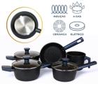 Conjunto Jogo de Panelas 4 Peças Antiaderente Tampa de Vidro Alumínio Cerâmica Cabo Baquelite Caçarolas Frigideira Leiteira p/ Cozinha