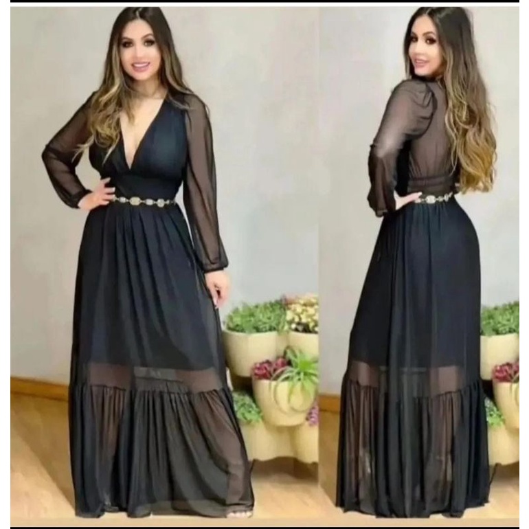 Vestido manga longa de tule, moda blogueira com franzido branco e preto
