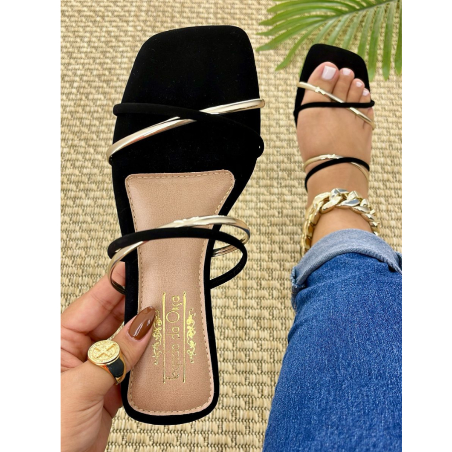 Sandália Rasteirinha de Tiras Metalizadas Feminina Macia Lançamento Chinelo Feminino (REF:3371)