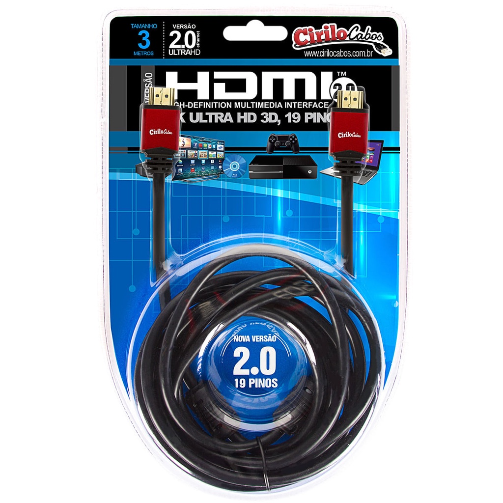 Cabo Hdmi 3m 2.0 19 Pinos Ethernet 3 Metros 4k Ultra Hd 3d