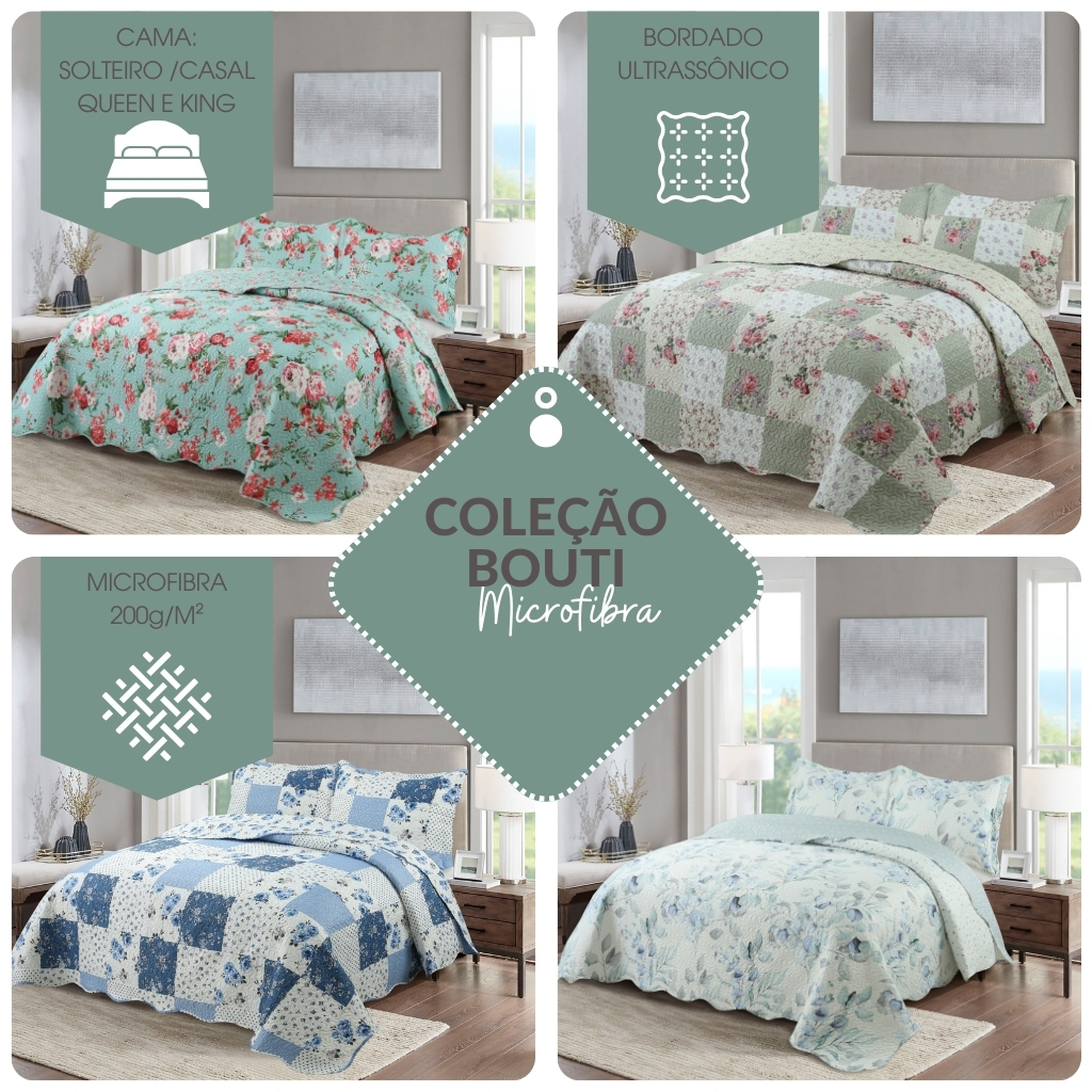 Kit Colcha Cobre Leito Casal Padrão Bouti Provence Microfibra Estampado Dupla Face