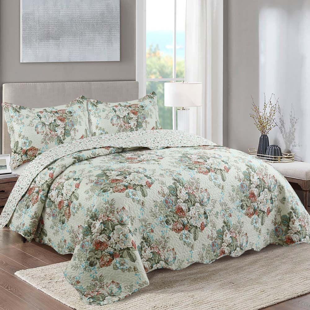 Kit Cobre Leito Colcha Mix Queen Estampado Dupla Face Floral 3 Peças - Mirela - Verde