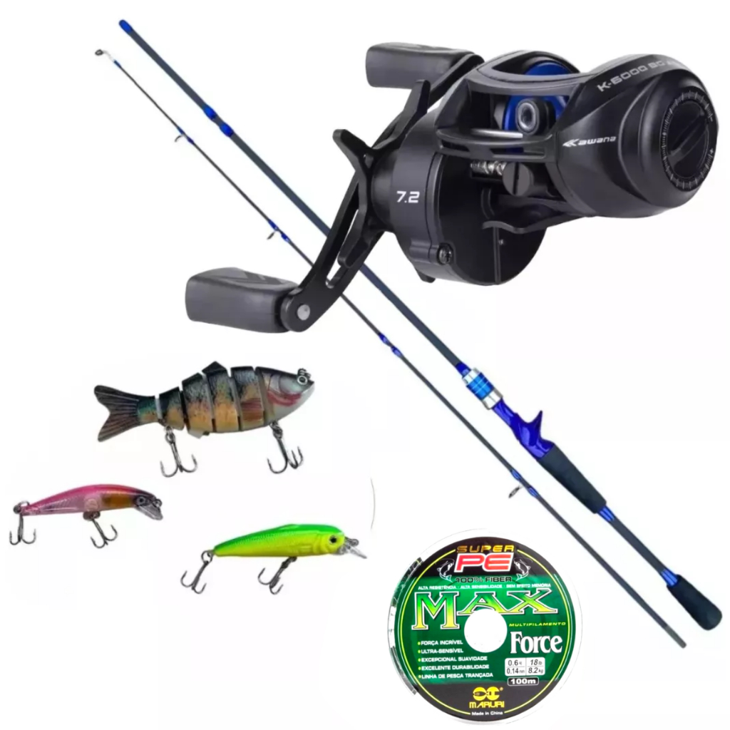 Kit Pesca Tucunaré Carretilha Kawana Anticabeleira + Vara Fibra Carbono 1,50m + Linha + Isca
