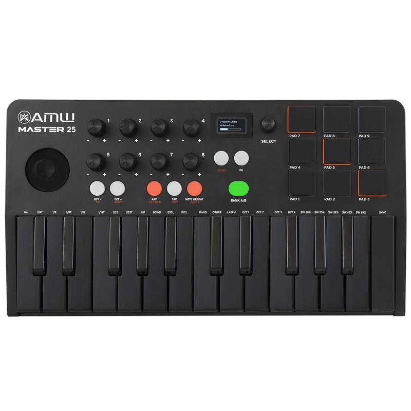 AMW Master 25 All Black Teclado Controlador Midi 9 PADs 8 Knobs Visor OLED