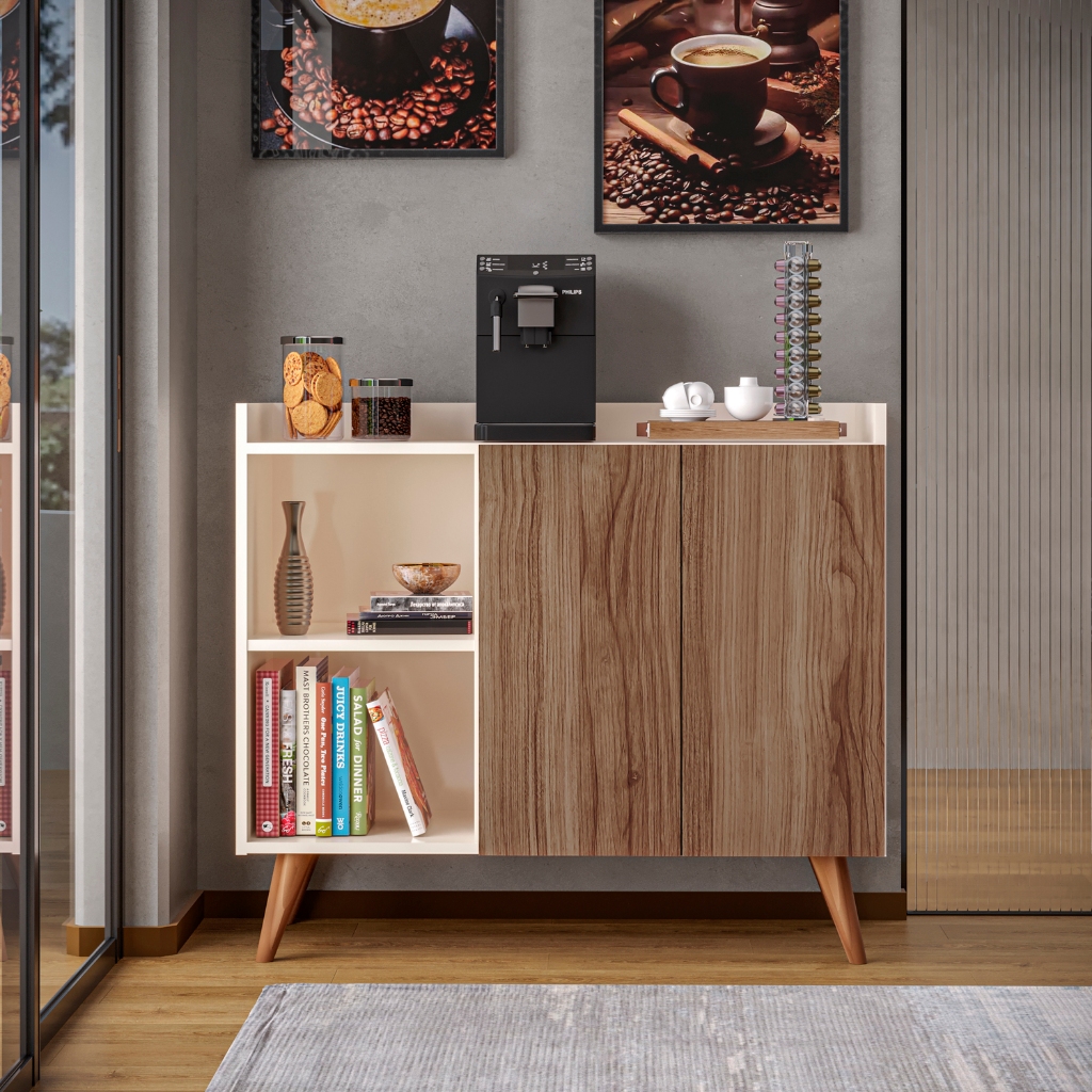 Buffet aparador 2 portas e prateleira sala com pés de madeira