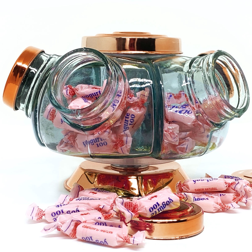 Bomboniere Mini Baleiro De Vidro Giratório Antigo Cobre 5 Potes com Tampa