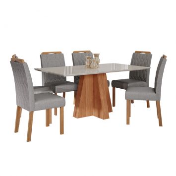 Conjunto de Mesa de Jantar Retangular com Tampo de Vidro Off White Ágata e 6 Cadeiras Juliana Linho Grafite e Cinamomo