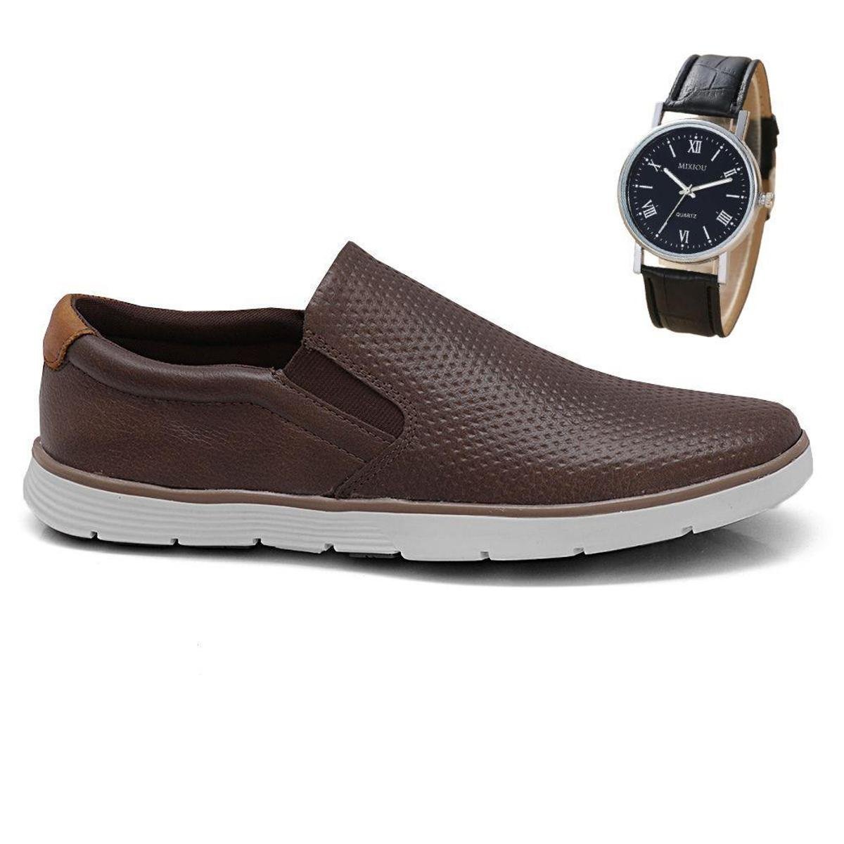 Tênis Slip On Masculino De Couro Casual Tênis Iate Sem Cadarço Elástico Calce Fácil + Relógio