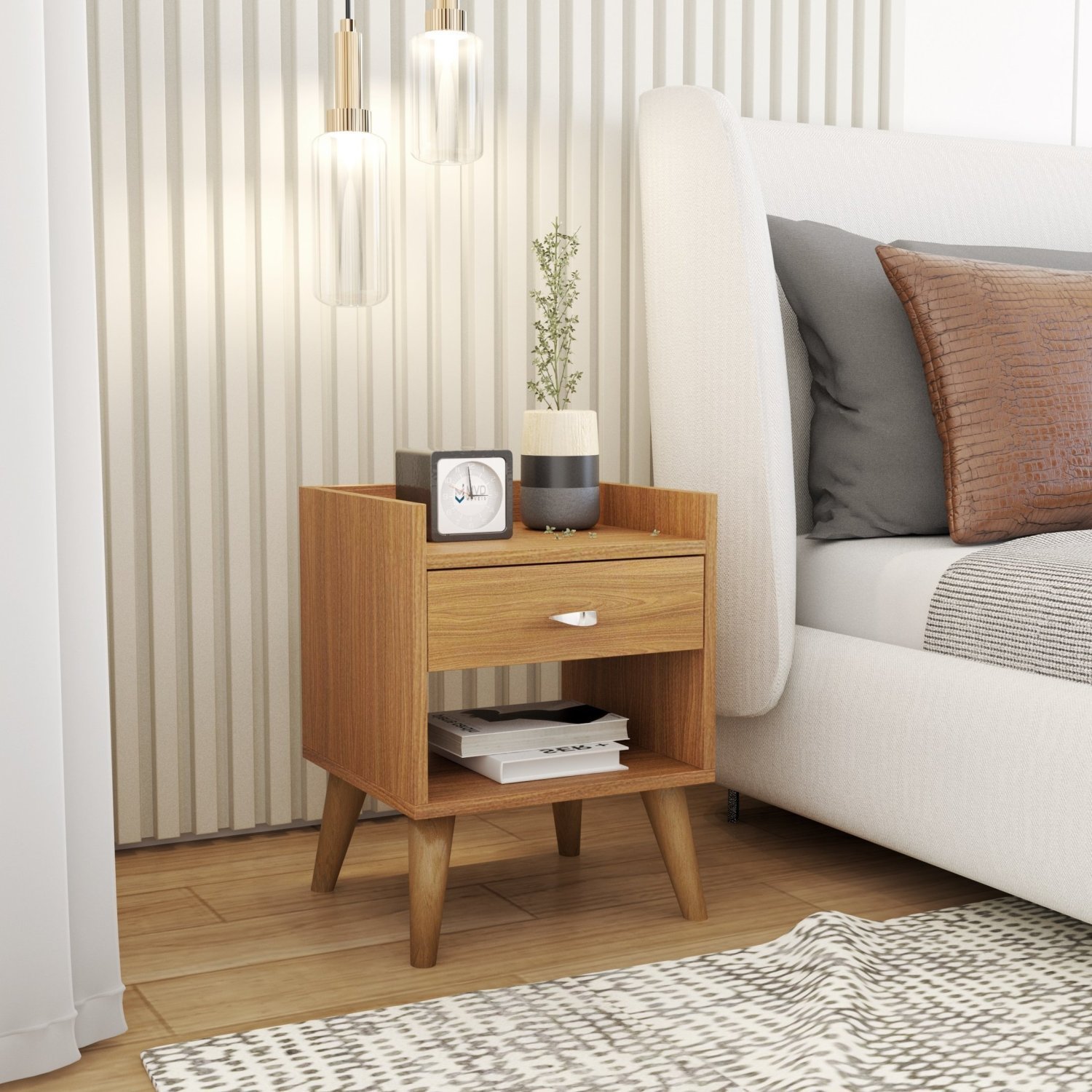 Mesa de Cabeceira Retrô Pés Palito em Madeira Maciça 1 Gaveta e Prateleira