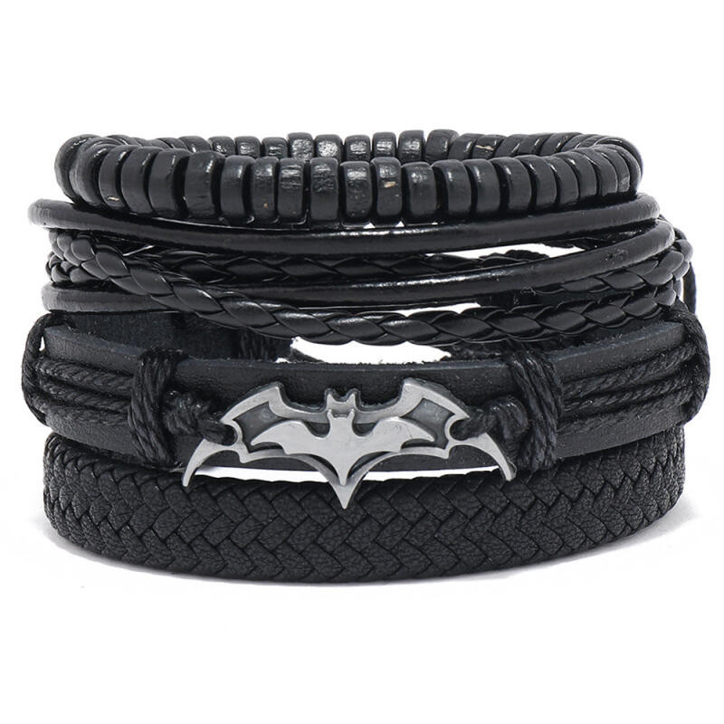 Conjunto 4PC/1 De Novas Pulseiras De Couro Vintage Multi-Camadas Com Contas Preto Batman Pulseira Ajustável Para Homens Acessórios De Jóias