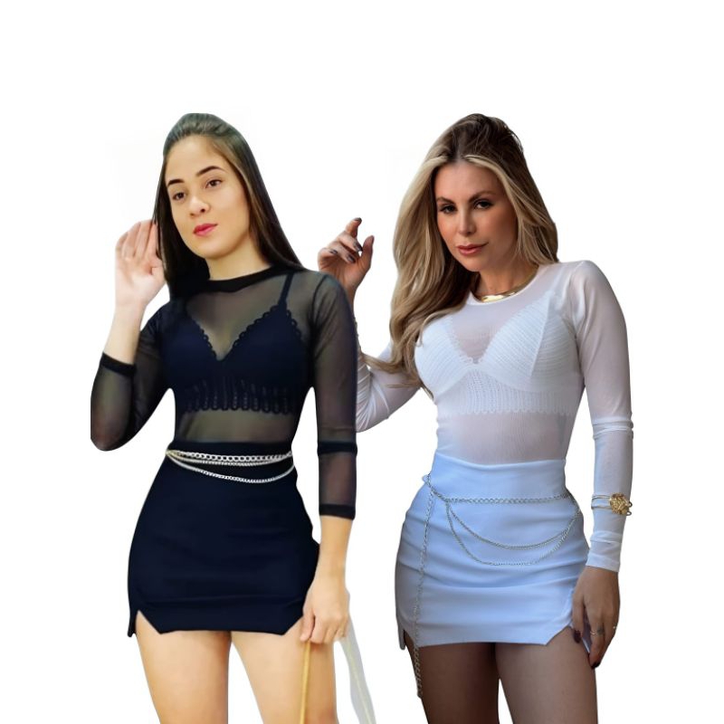 Conjunto com kit composto de quatro (4) peças, blogueira, short saia, cropped, body tule, cinto corrente COD05
