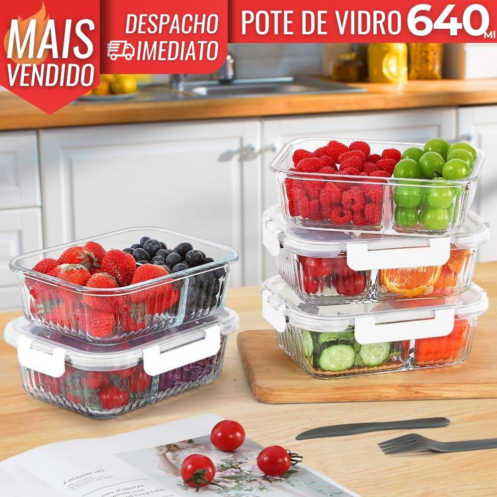 6 Pote De Vidro Hermético Retangular 640ml C/ Tampa Plástica Lancheira Marmita Forno Freezer Armazenar Guardar Resto Comida Fitness Micro-ondas