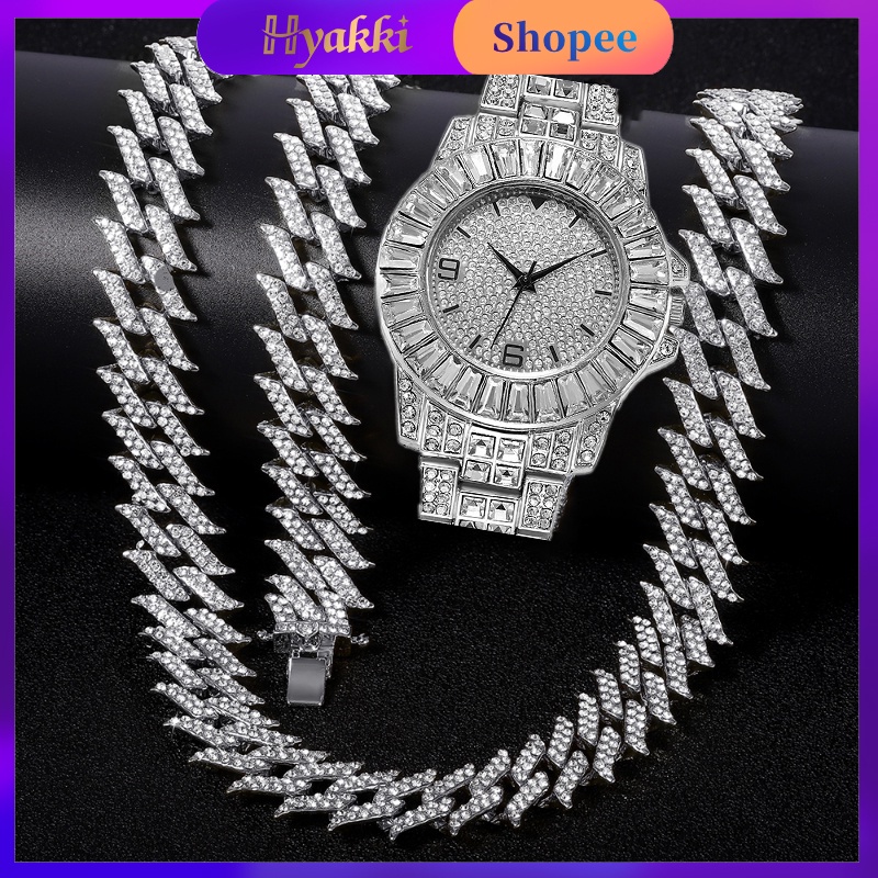 HYAKKI Ice Relógio masculino Colar Pulseira masculina Hip Hop corrente cravejada Diamante relógio cravejado Kit