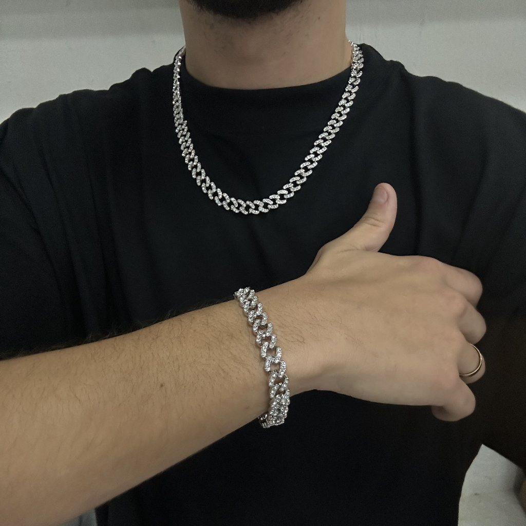 Kit Cravejado Cuban Corrente + Pulseira Ice - Moda Masculina e Feminina / Estilo Neymar / Zircônia / Joias / Trap Hip-Hop / Diamante / Brilhante / Acessórios / Promoção / Colar Cordão Prata