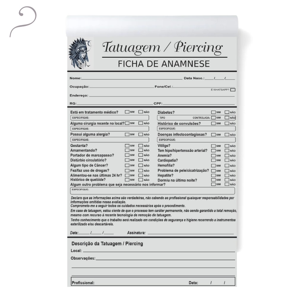 Bloco de Anamnese Ficha Checklist para Studio de Tatuagem e Piercing Tatoo Tatuador
