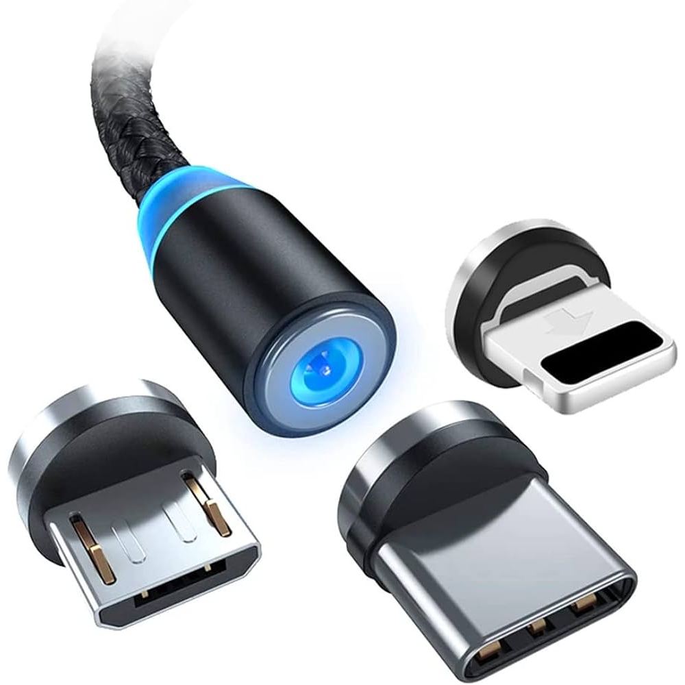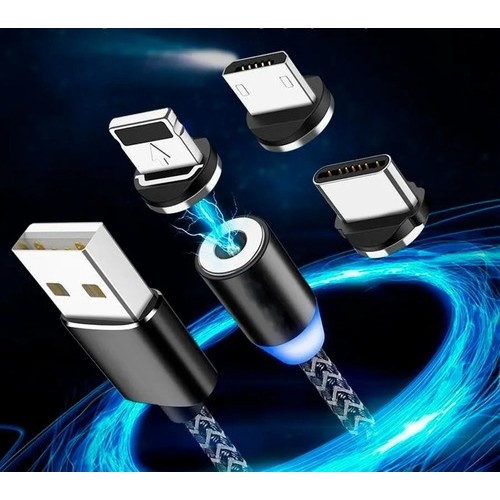Cabo Carregador Magnético Usb 3 Em 1 iPhone, Android V8 e Tipo C / Led Universal 360g