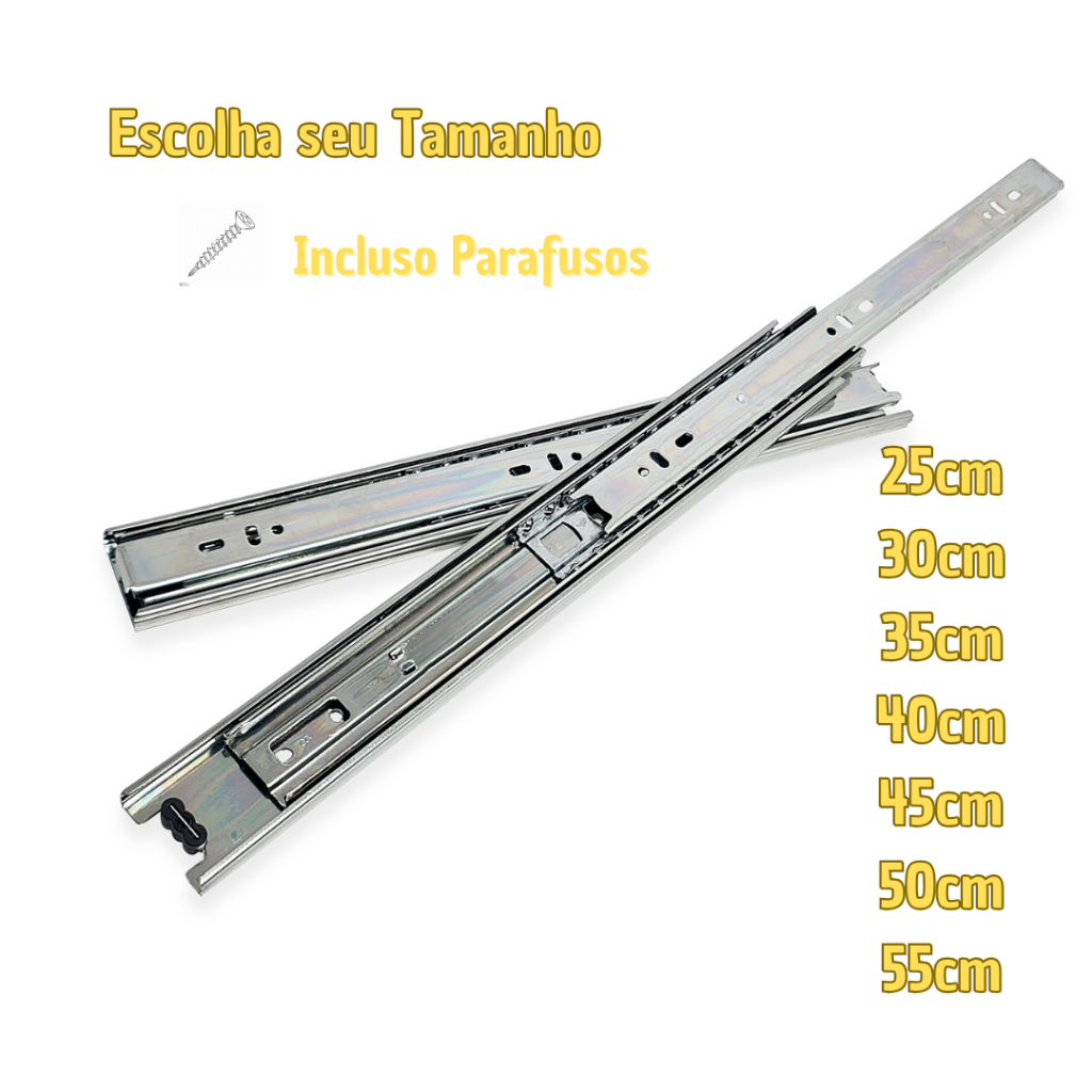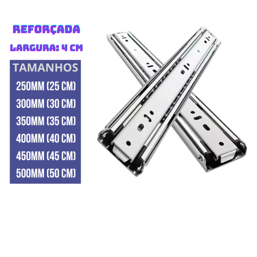 1 Par Corrediça Trilho Telescópica Reforçada Larga, Escolha Tamanho e Quantidade de Pares: 25cm 30cm 35cm 40cm 45cm 50cm