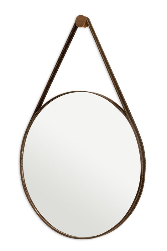 Espelho Redondo Adnet Parede Alça Em Couro 60cm C/ Pino Suporte