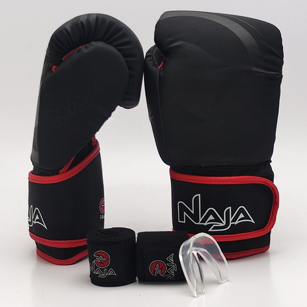 Kit Luva de Boxe Muay Thai Naja + Bandagem + Protetor Bucal + Bolsa - Melhor Proteção P/ Treinos e Lutas - Luva de Muay Thai Naja , Luva de Boxe Naja Black! * Promoção!