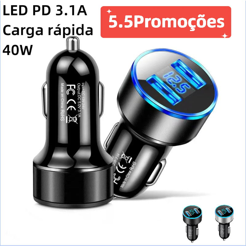 Carregador Veicular Carro Universal Turbo Ultra Rápido 2 Entrada USB de 3.1a e Display de LED com Voltímetro
