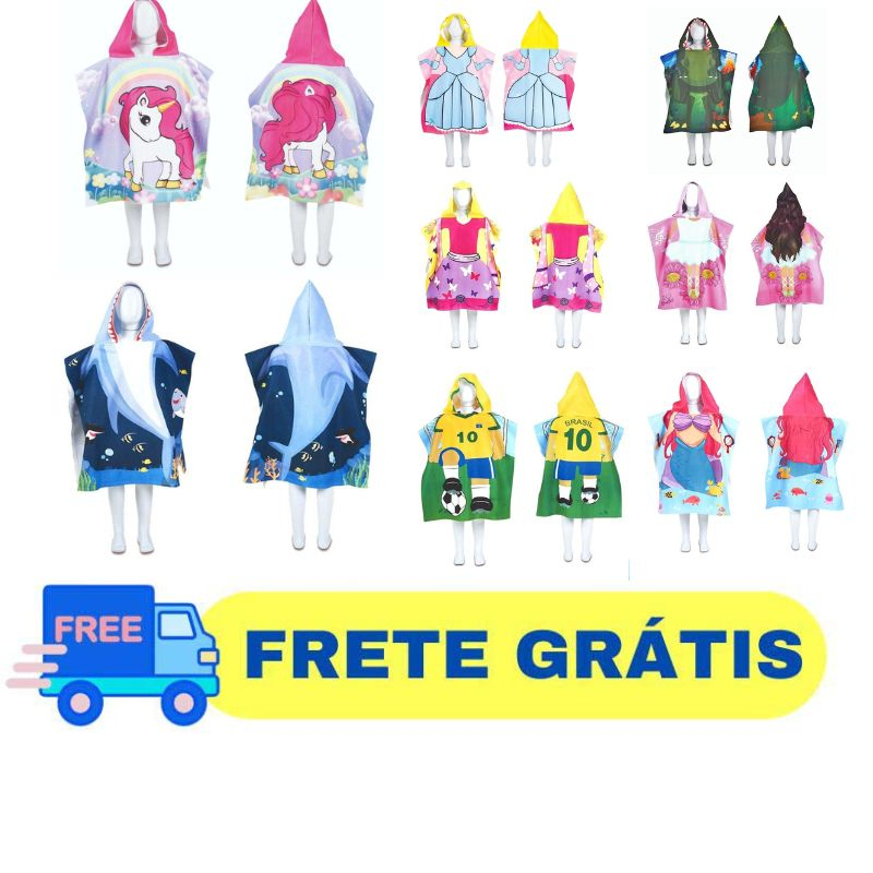 Toalha De Banho Praia Poncho Infantil Com Capuz Várias Cores E Personagens