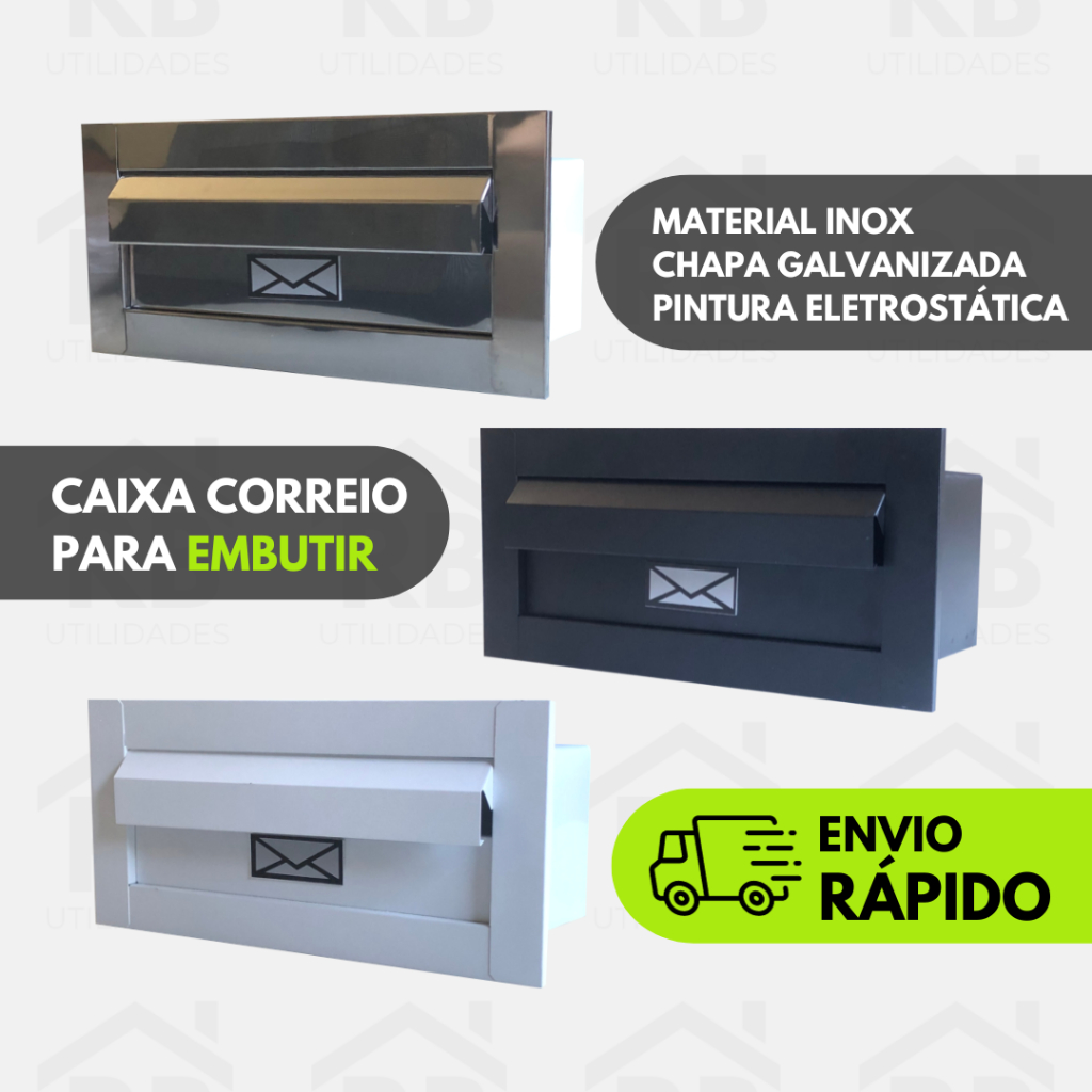 Caixa Correio Carta - Inox com Aba - Para Muro Parede de Embutir - 14cm Profundidade - Preto Fosco - Cromado - Branco - Preta - Cromada - Branca