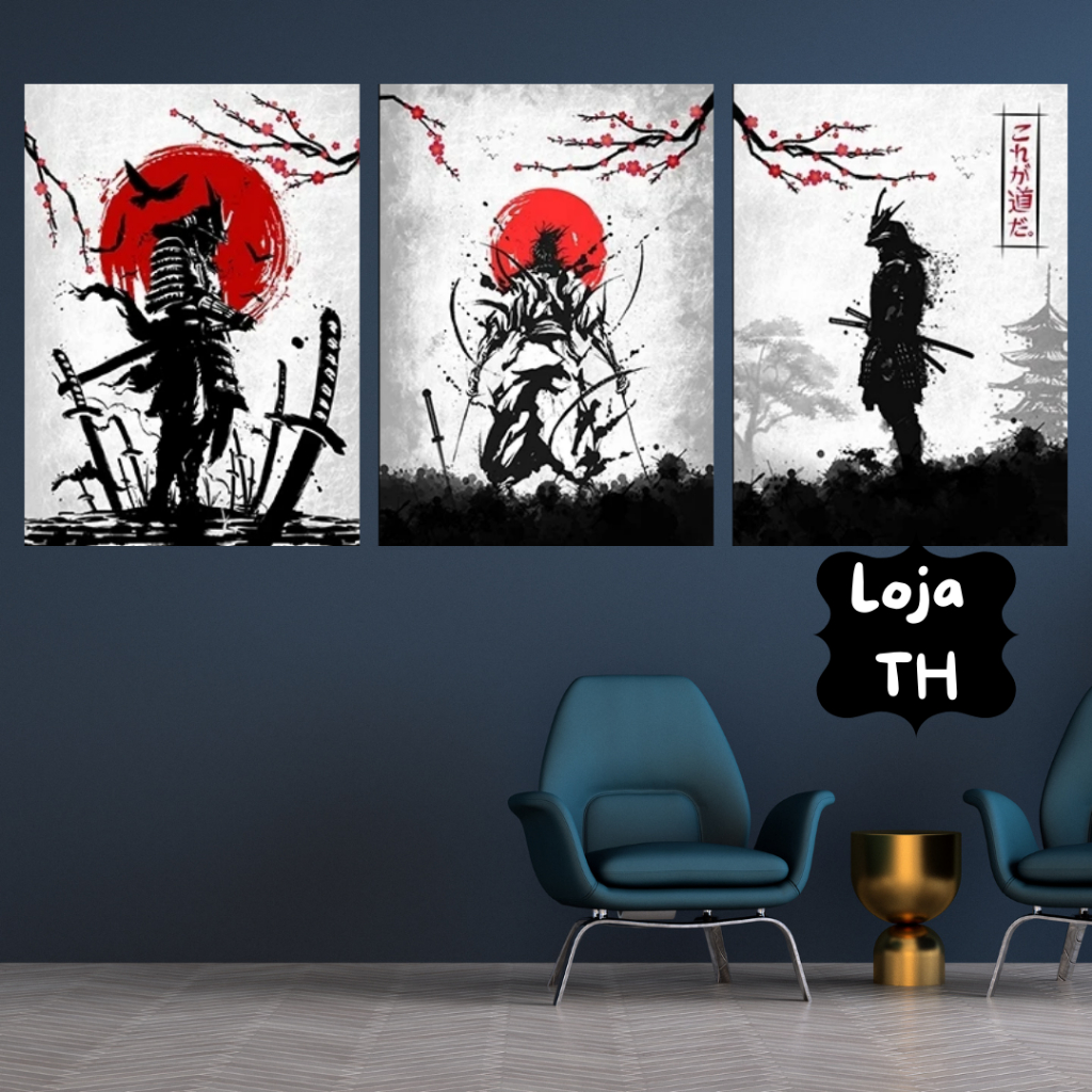 Quadros Decorativos 3 Peças 60x40 Arte Japonesa Samurai | Quadro de Decoração Para Quarto, Sala, Escritório
