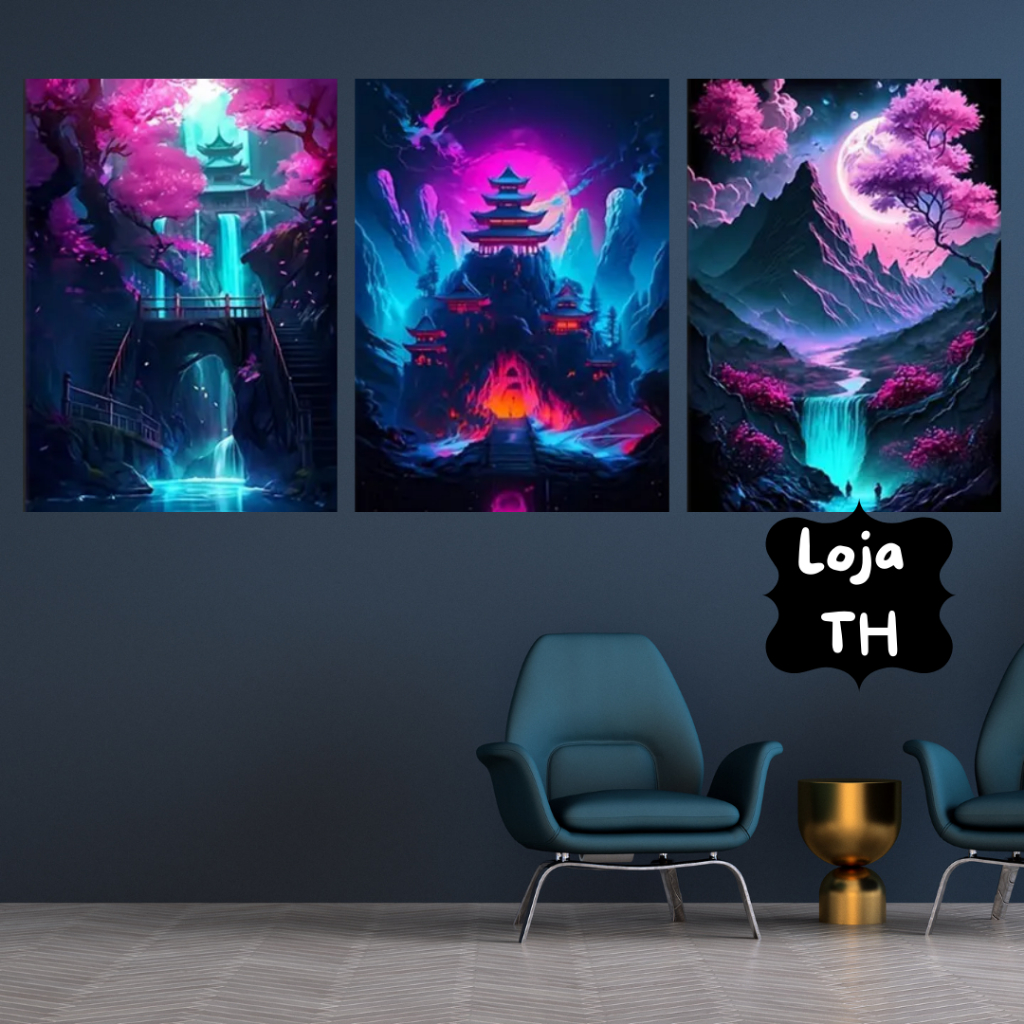 Quadros Decorativos 3 Peças 60x40 Pintura Casas Orientais na Montanha | Quadro de Decoração Para Quarto, Sala, Escritório