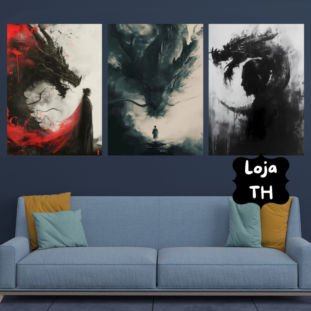 Quadros Decorativos 3 Peças 60x40 Arte Dragão Chinês | Quadro de Decoração Para Quarto, Sala, Escritório