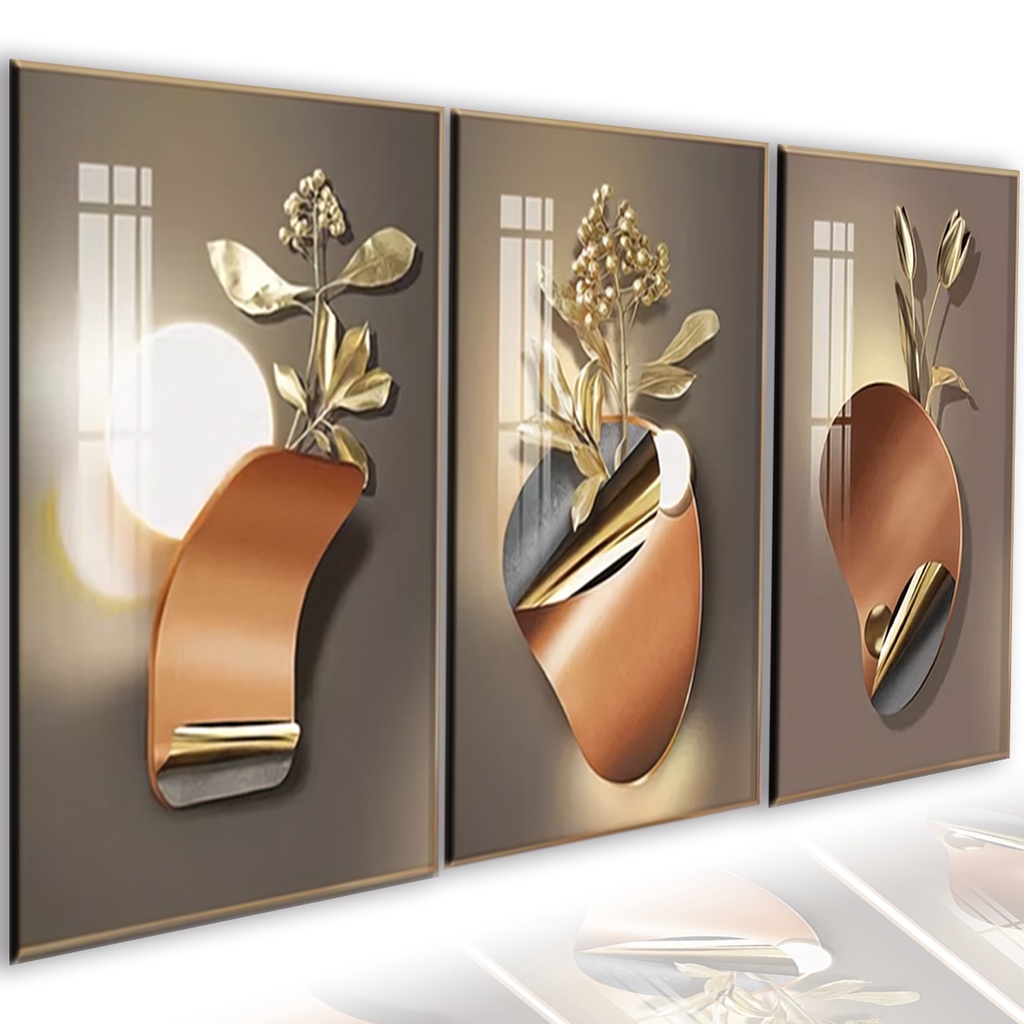 Kit 3 Peças Quadros Decorativos de Parede Mosaico Nordic Flor Dourada Luxo Pintura Folhas Ouro Sala Quarto