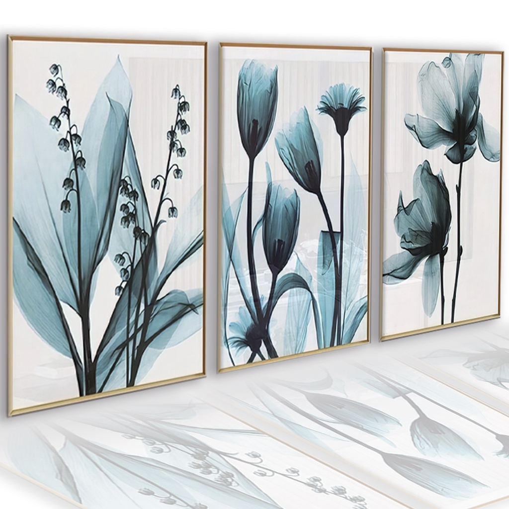 Kit 3 Peças Quadros Decorativos de Parede Para Sala Quarto Flores Azuis Floral Colorido Abstrato Moldura Luxo Mdf Top