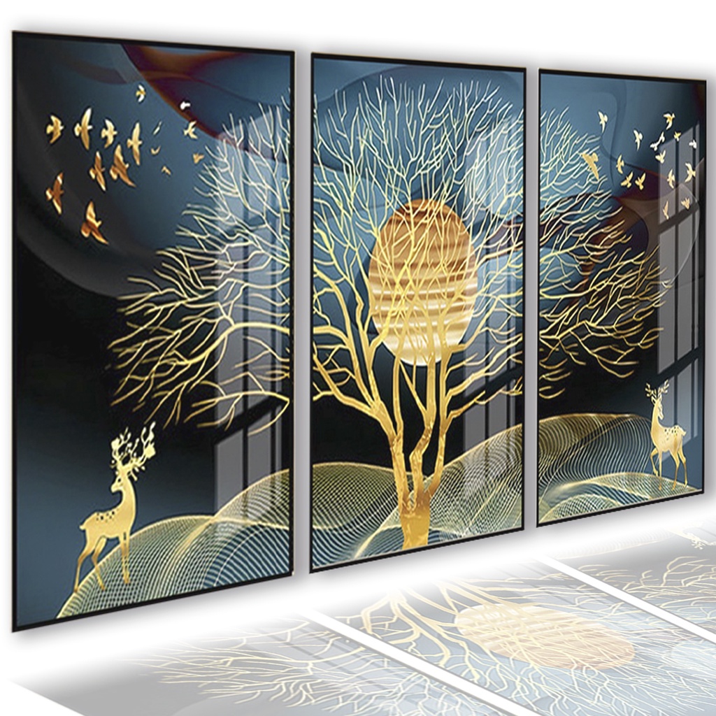 Kit 3 Peças Quadros Decorativos De Parede Mdf Cervo Pintura Gold Árvores Natureza Abstrato Moldura Quarto Sala Escritório