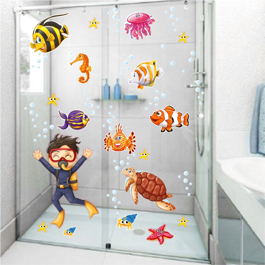 Adesivo Para Box De Banheiro Infantil Fundo Do Mar Menino e Peixes