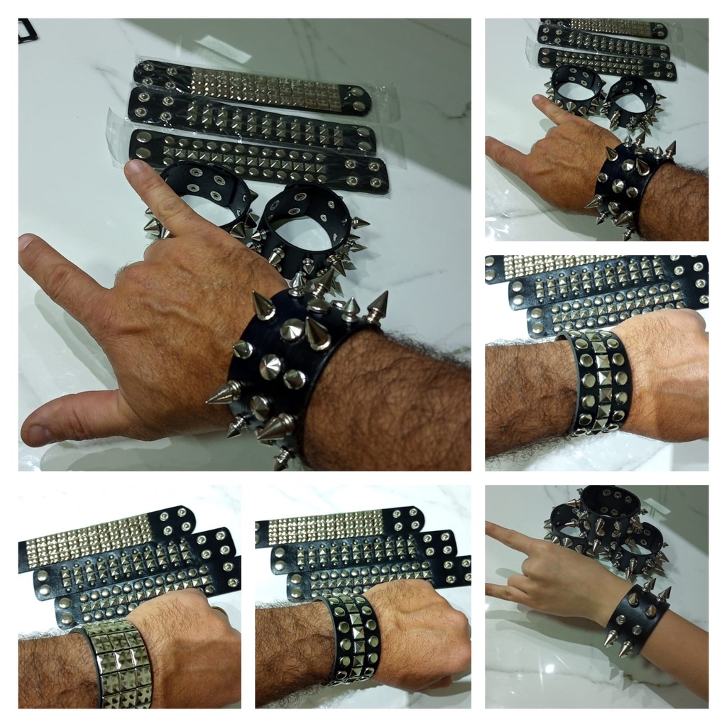 Pulseira De Couro Sintético Preta Estilo Punk Rock Com Spike Cravejado Rebite.