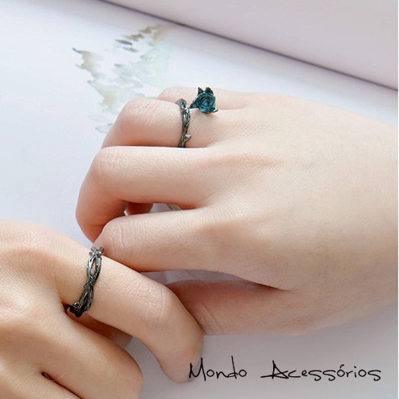 Anel Criativo Diferente Par Aliança de Namoro Rosa Negra e Coroa de Espinhos Estilo Dark Punk Gótico Romântico Ajustável Prata 925 Chapeada