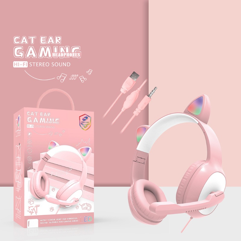 Fone Orelha De Gato Gatinho Cat Intra-Auricular Ear Com Led Rgb Headphone Com Fio Usb Para Jogos Meninos Gilrs PC Stereo