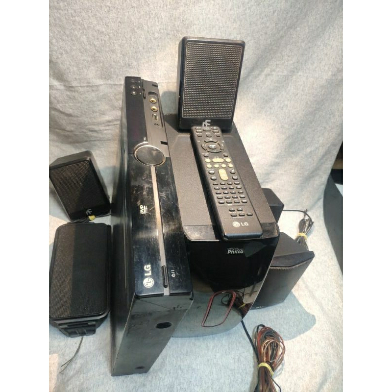 home theater LG ht305su funcional. precisa limpar a carcaça. tem um conector atras que a abinha de colocar o fio quebrou mas dá pra encaixar. controle remoto. o subwoofer é da Philco. ⚠️ AVISO AOS GOLPISTAS! ⚠️ Produto com lacre rompido NÃO será aceito!