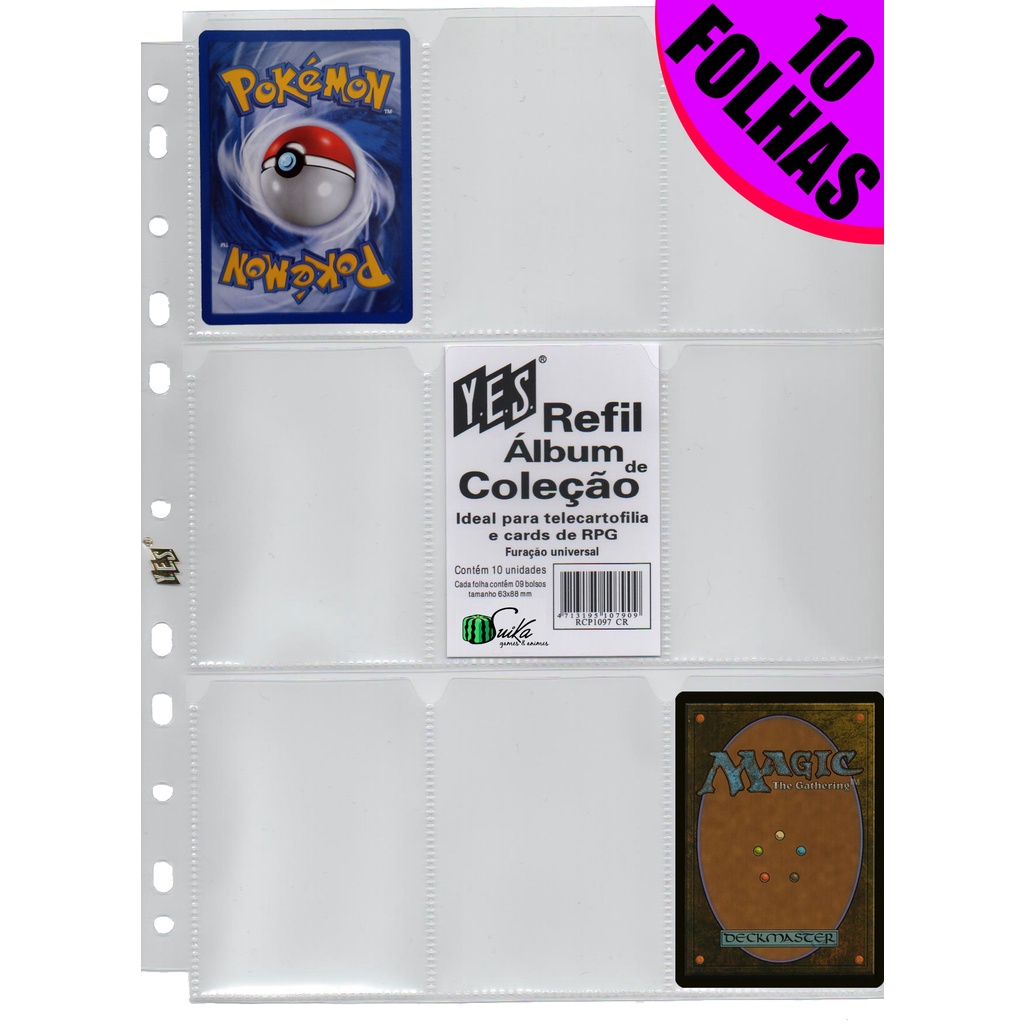 Kit com 10 Folhas para Cards e Cartas para fichário pasta Álbum argola 11 Furos 9 Bolsos Pokémon Magic Yugioh RPG Cardgame Figurinhas Coleção Colecionável Kpop Futebol copa do mundo bts black pink dragon ball naruto DIGIMON ONE PIECE