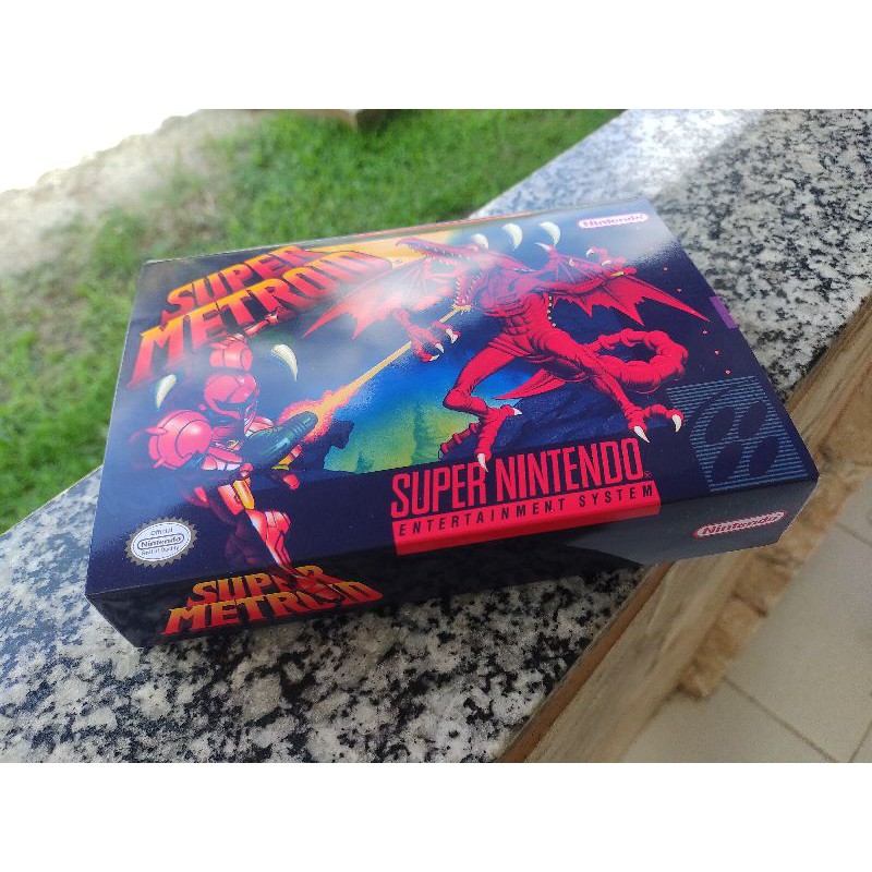 caixa com berço repro + label frente e verso do jogo de super nintendo snes super metroid