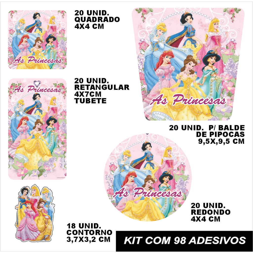 KIT COMBO FESTA INFANTIL 98 PEÇAS PERSONALIZADO AS PRINCESAS ADESIVO TAG ETIQUETA LEMBRANCINHA BALDE DE PIPOCA COPO SACOLA LATINHA MARMITINHA TUBETE CONVITINHO SO UM BOLINHO CONJUNTO COMPLETA ENTREGA RAPIDA CORES VIBRANTES E RECORTE PERFEITO