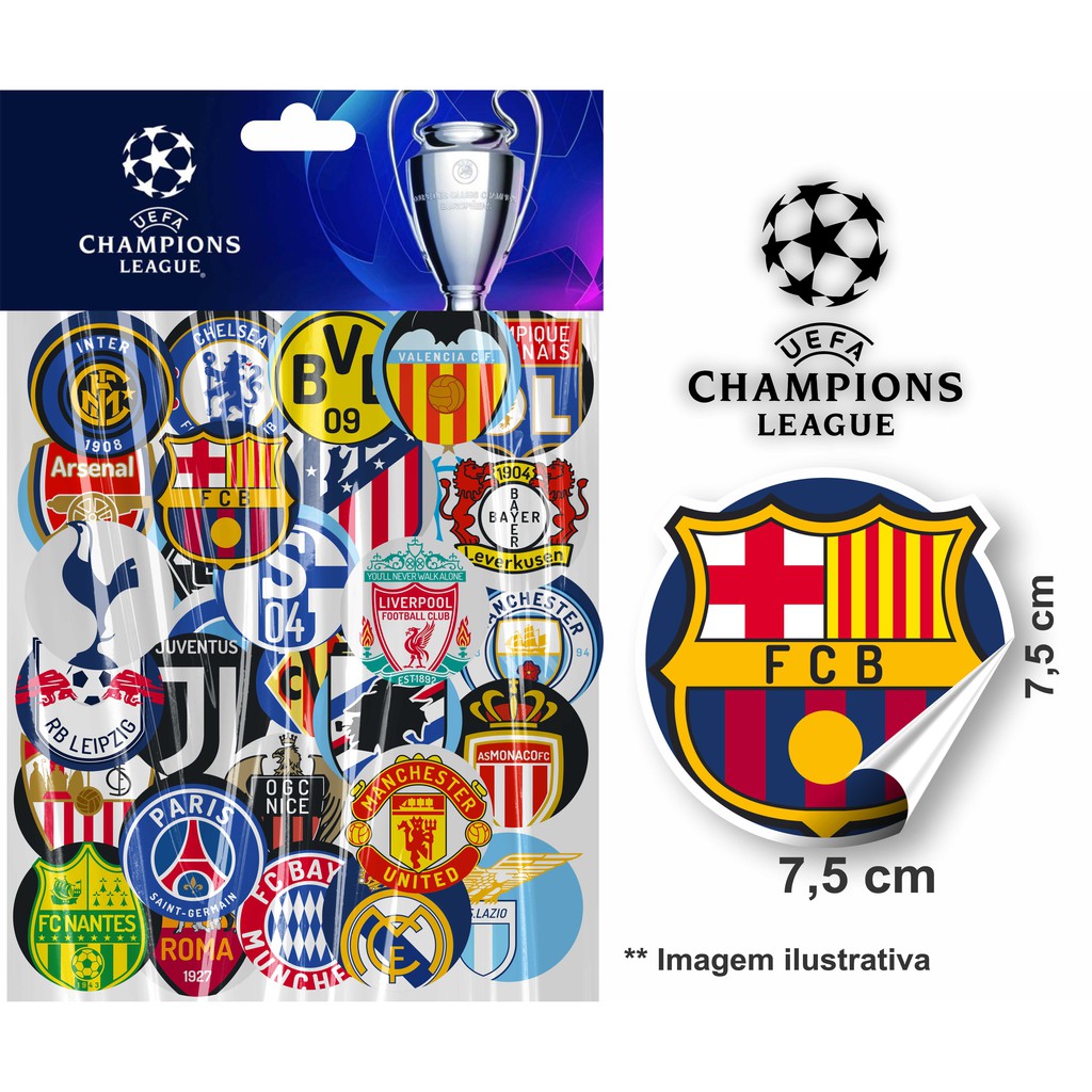 Champions League UEFA Kit com 30 Adesivos - Times Futebol Europeu Aprox. 7,5cm cada. Barcelona, Chelsea, Real Madrid, Paris Saint German