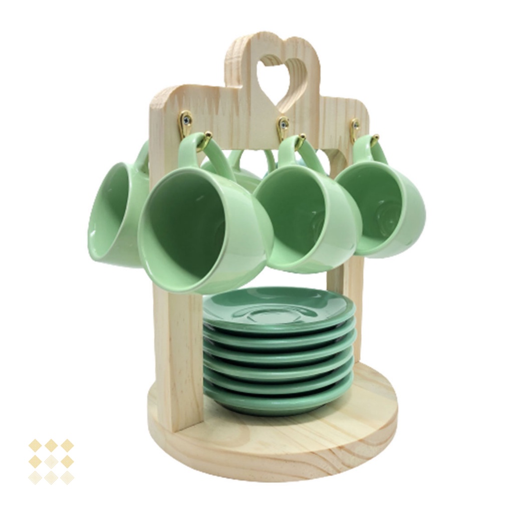 Jogo 6 Xicara Cafe Com Pires Porcelana Verde com Suporte Coracao - Mundo da Porcelana