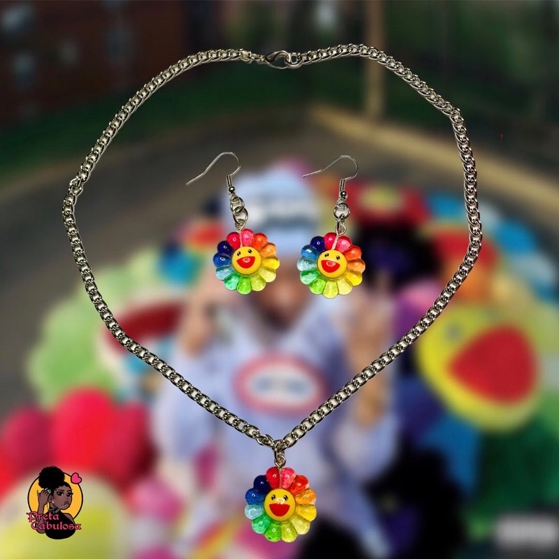 Colar e brinco flor Takashi Murakami | flor colorida sorridente aesthetic pop y2k hiphop moda
