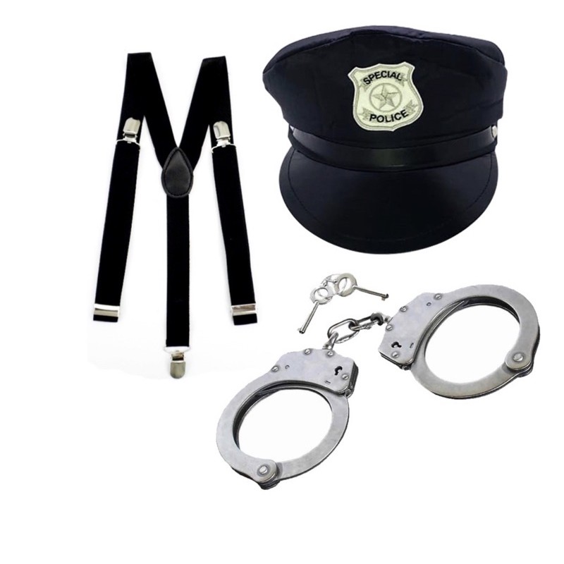 Fantasia Policial Quepe, Suspensório e Algemas 3pçs Carnaval Adulto Halloween Festa Cosplay