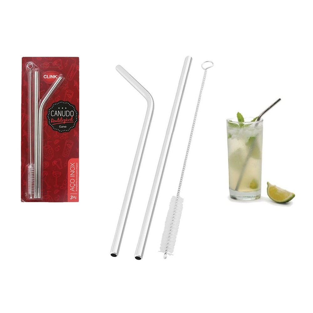 Canudo de Aço Inox Reto e Curvado Reutilizável com Escova para Limpeza 26,5cm
