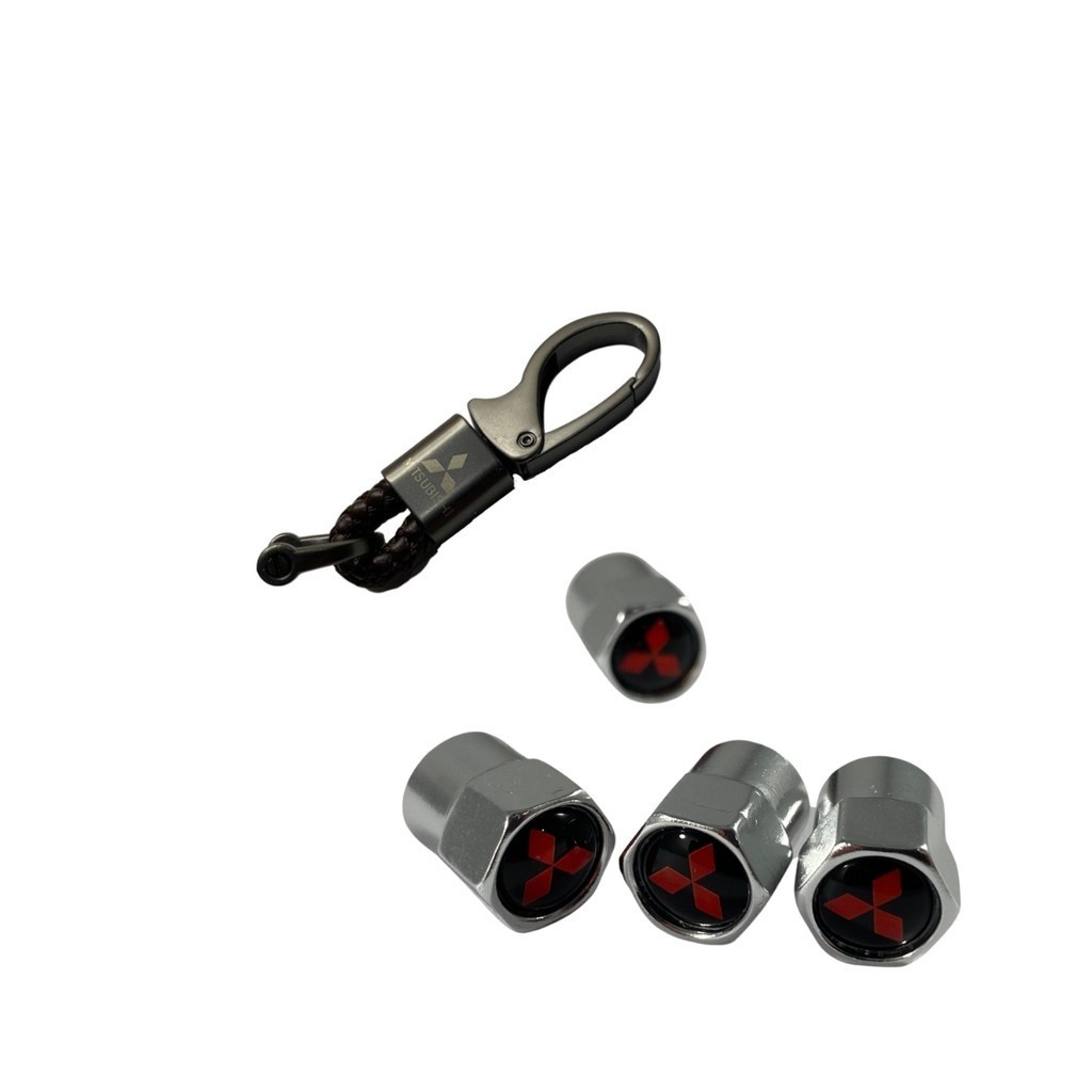 Kit Chaveiro Carro Metal Couro Tampa Válvula Pneu Mitsubishi Eclipse Cross Outlander Marrom + Nfe
