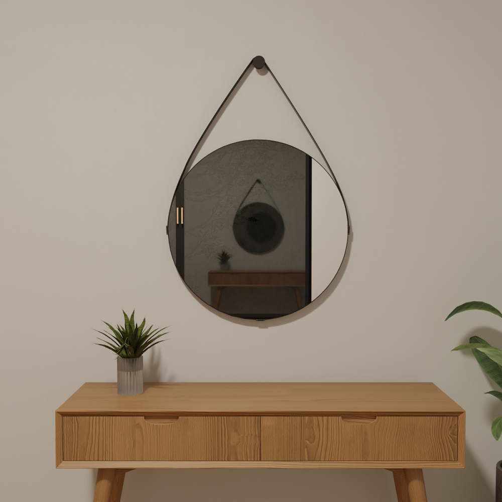 Espelho Redondo Adnet 40 cm Sala / Quarto / Banheiro / Com Alça Couro Suporte e Pendurador